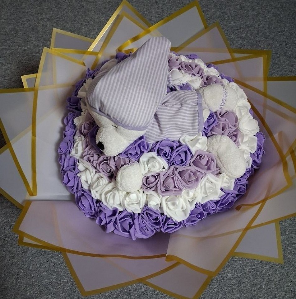 Duftrosenstrauß Schlafendes Teddy: Duftrosen 3 farbig, Kuscheltier, Beleuchtung, kann selbst stehen/liegen. Man kann ein Band mit dem Namen des Kindes oder Partners dazu machen