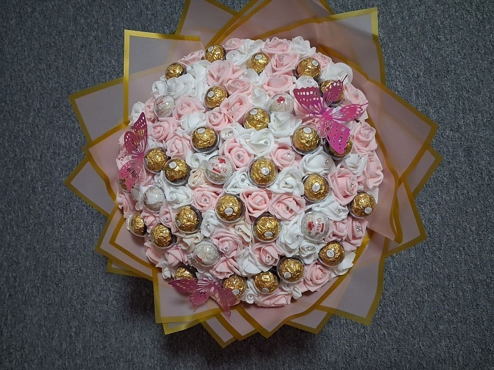 Bloom Deluxe: Großer Duftblümenstrauß mit Beleuchtung, steh/liege funktion, Kugeln mit Prallinen, Schmetterlinge. Man kann einen Band mit Beschriftung dazu machen