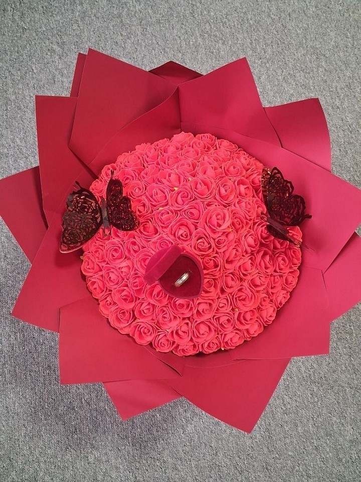 Duftrosenstrauß Marry Me: Duftblümenstrauß in Rot mit eine Rosen Schatulle in der mitte. Ideal für einen Antrag (Ring) oder für einen Ketten Anhänger oder Ohrringe. Mit Schmetterling