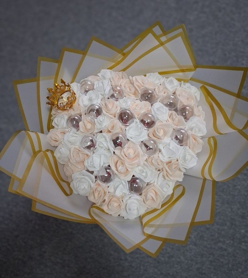 Seifenblumenstrauß Gold: 50 Seifenrosen in Gold, Kugeln mit Prallinen, Deko Vogel, Beleuchtung, kann selbst stehen/liegen und Band mit schrift...