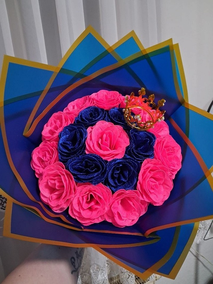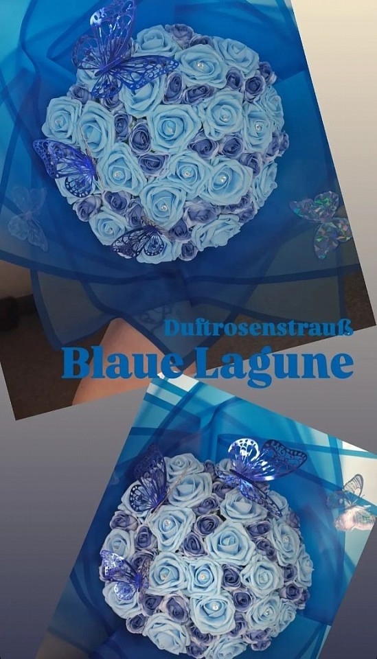 Duftglitzerblumenstrauß: 52 Rosen mit Glitzer und Duft in 2 Blau Farben Rosen, mittlere Krone in Silber, auf Wunsch ein Band mit Schrift möglich